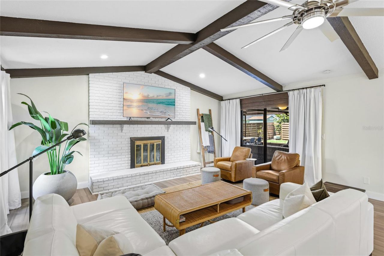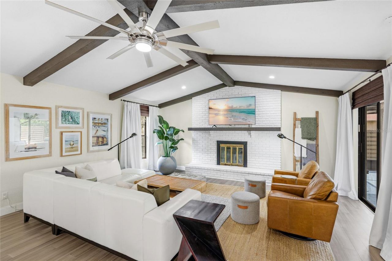 Come see this home and you'll be smitten with its appeal, timeless design, flair and attention to detail. Each room has been thoughtfully planned out and designed for style and comfort in mind. The beautifully appointed Great Room, which is nothing short of breathtaking, showcases a dramatic beamed cathedral ceiling in rich brown tones that contrast elegantly next to the ceiling. Anchoring this space is a stunning brick wood burning fireplace - an eye catching focal point adding to the warmth and character. A brushed nickel ceiling fan with LED lighting lends to the stylish decor of this room which is sure to become a favorite gathering place for friends and family. The kitchen features classic shaker cabinetry, a striking tile glass backsplash, sleek granite countertops, 2022 stainless appliances, a pantry closet, barstool seating, ceramic plank tile flooring and a door accessing the over-sized screened lanai and fully fenced backyard for easy indoor-outdoor living. Bamboo flooring throughout the main living areas and bedrooms makes for an easy smooth visual transition of rooms adding to the clean modern aesthetic. All bedrooms are generously sized to easily accommodate king size beds. The oversized Primary Suite is a true retreat with its own sitting room and desk that accesses the lanai through sliders. You'll also appreciate the convenience of having an indoor laundry room. Throughout this picture perfect home you'll find textured ceilings, custom drapery, Room darkening shades and finishes adding to the polished contemporary feel. Major updates include a 2022 roof and A/C. Arrive in just minutes to shopping, medical facilities, IMG Academy, GT Bray Park and Bradenton's beautiful beaches which are close to a five mile drive away. Enjoy living in an X non-flood zone with no Homeowners Association, CDD fees or deed restrictions. This is the one you've been waiting for!